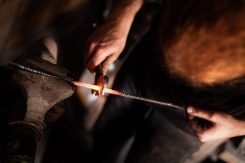 Il faut d’abord allumer un feu (logique, me direz-vous pour de la forge) et sélectionner une tige de métal à modeler. Pour obtenir la forme torsadée du torque, j’ai dû d’abord transformer la barre ronde en une barre carrée. Et pour ça, on prend un marteau, on chauffe l’acier et on tape. On tape beaucoup. Et on répète l’opération tant qu’on n’obtient pas le résultat voulu. Je peux vous garantir qu’à ce moment, ce sont les muscles de vos bras qui chauffent.